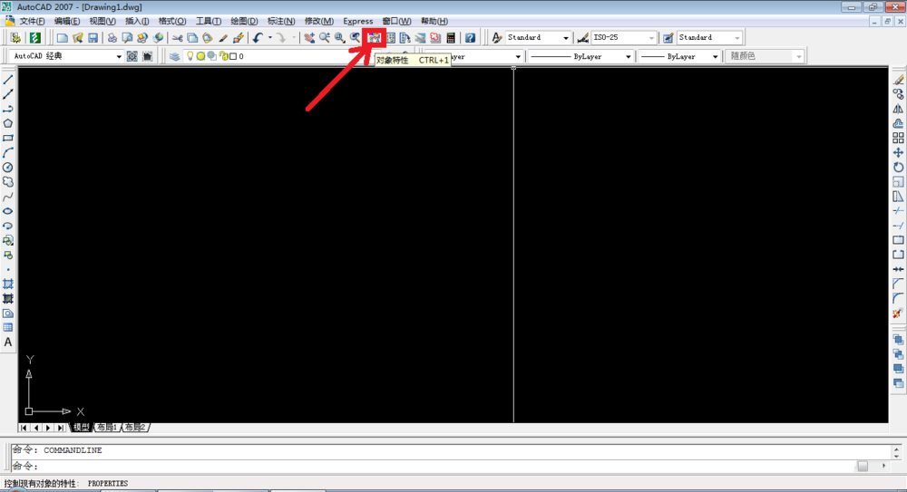 打開AutoCAD,打開工具欄中的“對象特性”按鈕,或者按“Ctrl+1”快捷鍵,打開特性