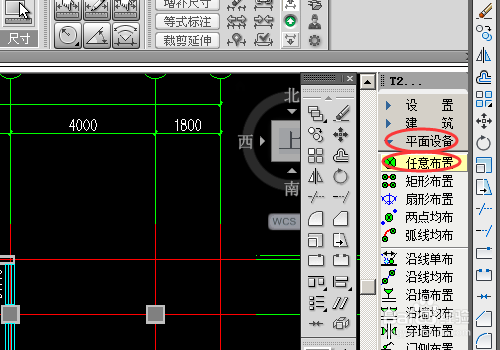 1、首先我們在打開圖紙中點擊右側的工具欄中選擇平面設備--任意布置。如果需要用到其他的布置可以根據需要選擇下方的矩形、扇形、兩點等布置方式。