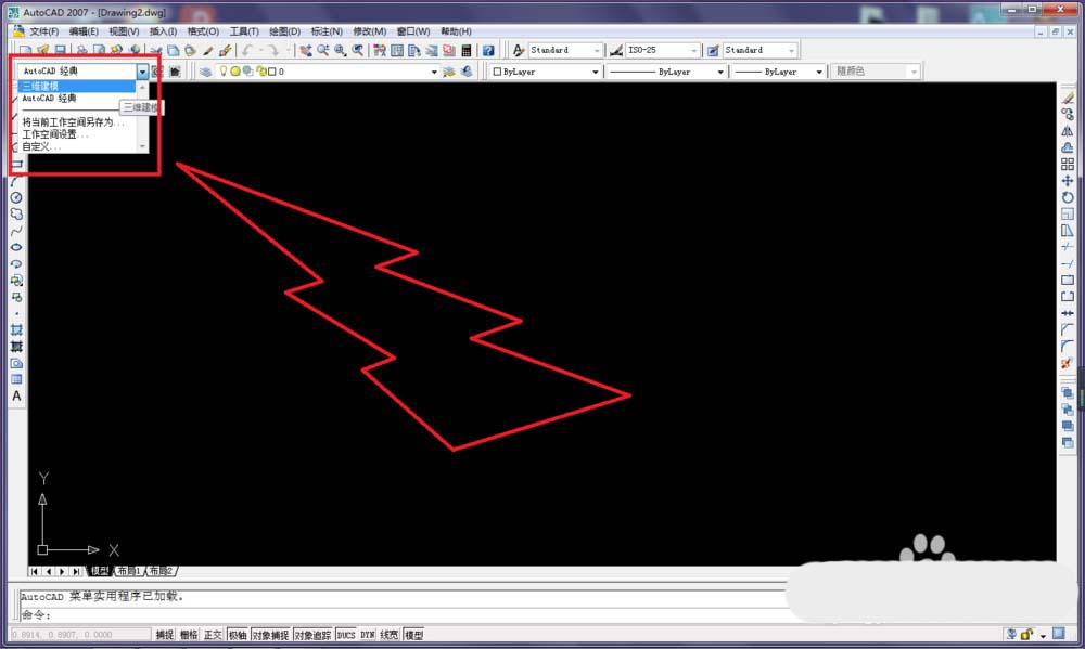 1、打開CAD,新建一個空白文件,這里說明一下,我們因為要畫三維,所以最好還是將工作界面從經典改為三維建模,見下面兩幅圖