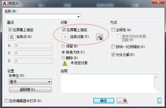2、在塊定義工具欄中,“對象”一欄中去掉在“屏幕上指定”,然后點擊選擇對象右側圖示位置,然后選中圖中要定義為塊的圖形,選中后,點擊空格退回到工具欄中。