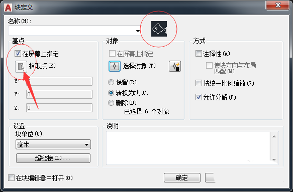 4、基點選擇成功之后,輸入你要定義塊的名字,以及單位等,然后點擊右下角“確定”即可,如圖所示,圖形被定義為一個整體。