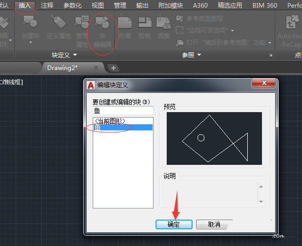6、在“插入”工具欄中,點擊快編輯器,然后選擇你所定義的塊,點擊“確定”,在快編輯器中即可編輯你所定義的塊,編輯完畢之后,點擊右上角的“關閉編輯器”,即可退出編輯保存塊。