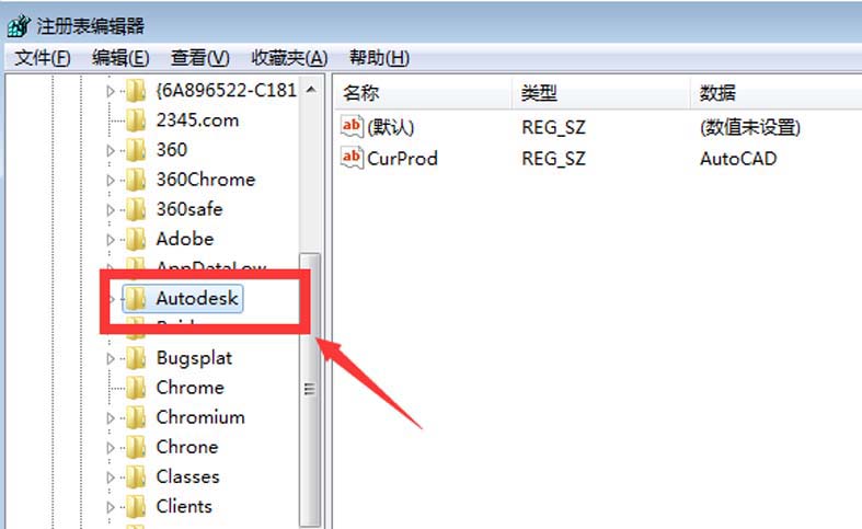 4、待進入注冊表之后,在注冊表按照HKEY_LOCAL_user/software/autodesk找到Autodesk文件,將其刪除,然后按住鍵盤上的CTRL+f組合鍵,分別找到以7d2f開頭的文件,然后并將這些文件刪除即可徹底清除cad2008軟件,如圖