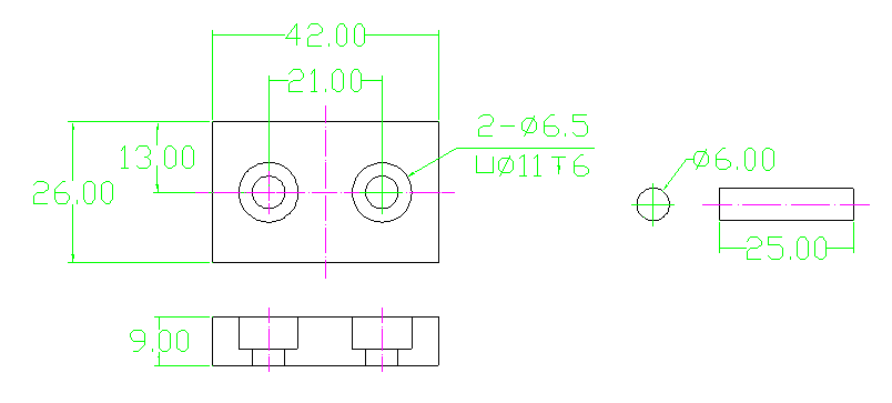 2、在進(jìn)行繪制圖紙之前要先對(duì)夾具進(jìn)行測(cè)量,經(jīng)過(guò)測(cè)量我們得到了夾具的尺寸,夾具由6個(gè)零件和1個(gè)銷和兩個(gè)螺絲構(gòu)成,零件1的尺寸,如圖所示