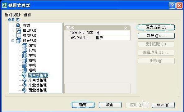 1、打開AutoCAD軟件,進入到三維坐標界面。在命令行輸入V命令按回車鍵,選擇西南等軸測→置為當前→確定。如圖所示,就進入到三維坐標。