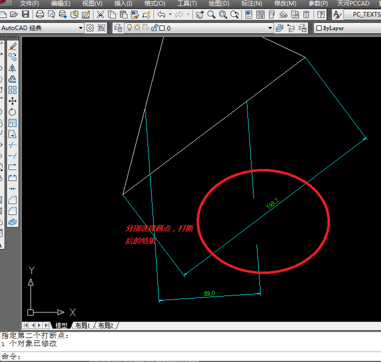 3、先后選擇兩點來確認(rèn)打斷范圍,打斷完成,如圖: