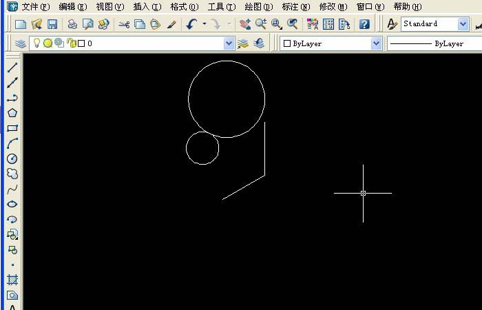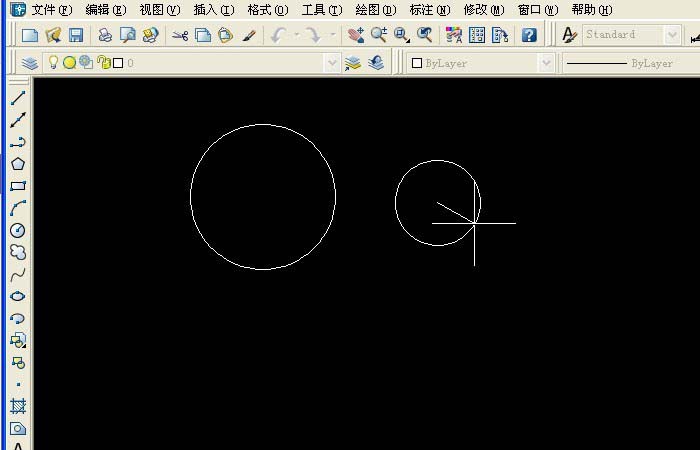 4、在CAD畫布上,用鼠標(biāo)左鍵單擊繪制一個小圓,在右邊繪制一根直線后,選擇兩個相切點后,接著移動鼠標(biāo)繪制出一個大圓出來,如下圖所示。