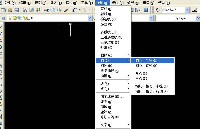 1、打開CAD的軟件,新建一個CAD文件。然后,鼠標(biāo)左鍵單擊菜單下的【繪圖】>>【圓】>>【圓心、半徑】,如下圖所示。