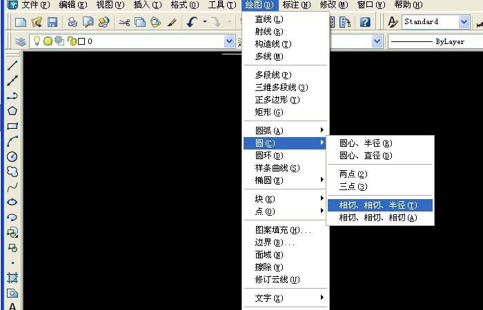 3、清除畫布上的線,接著,鼠標(biāo)左鍵單擊菜單下的【繪圖】>>【圓】>>【相切、相切、半徑】,如下圖所示。
