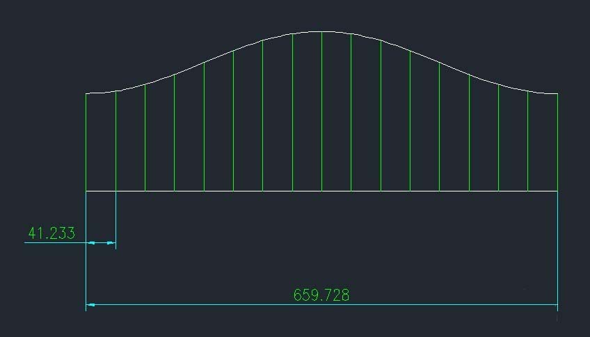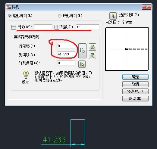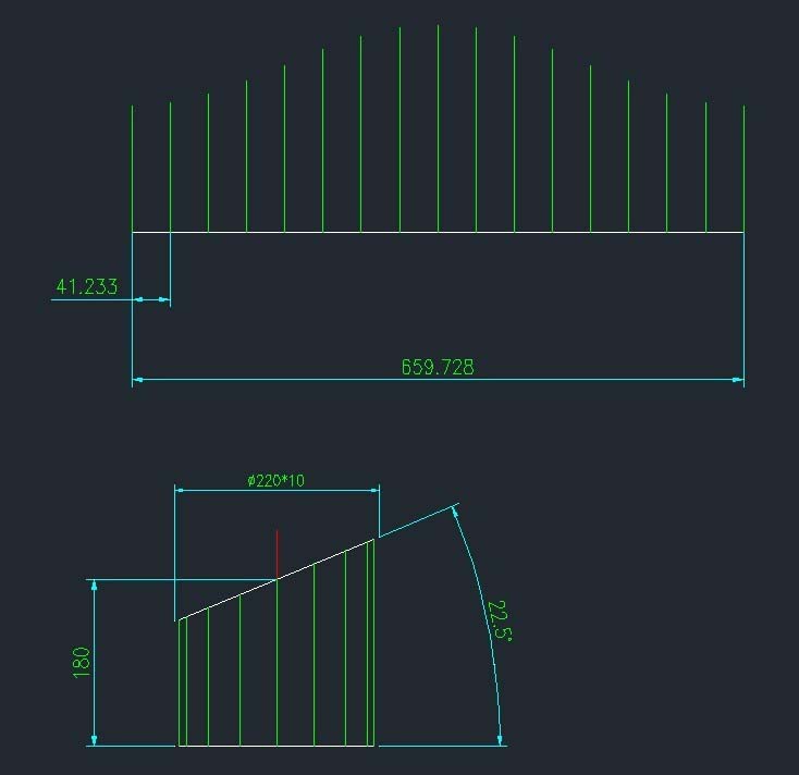 6、算出中徑210的周長為210*3.141592654=659.734,將周長659.734作16等份:659.734/16=41.233。繪制一條41.233的線段,并進行矩形整列