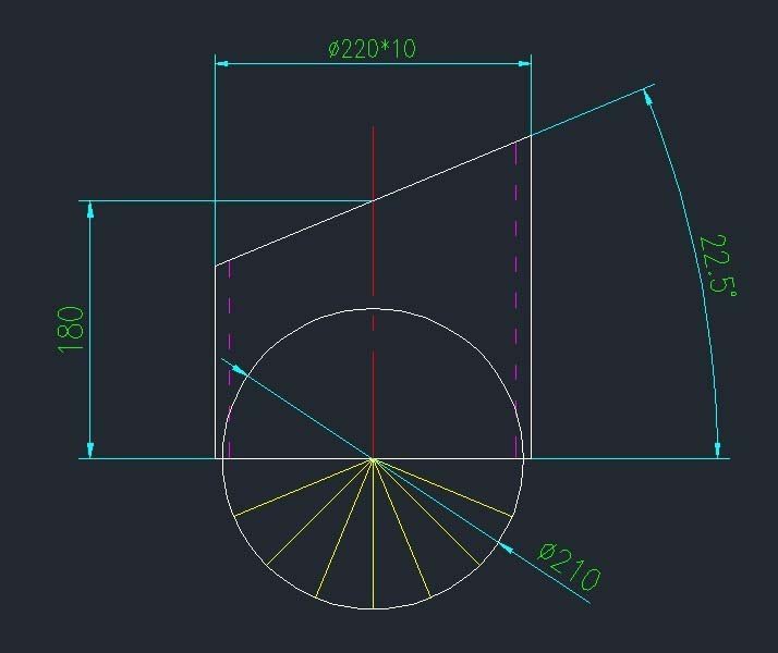 3、以剛才繪制圓的圓心繪制16等份線(黃色)(按鋼管直徑大小設置等份數量,等份數量均需4的整數倍)。