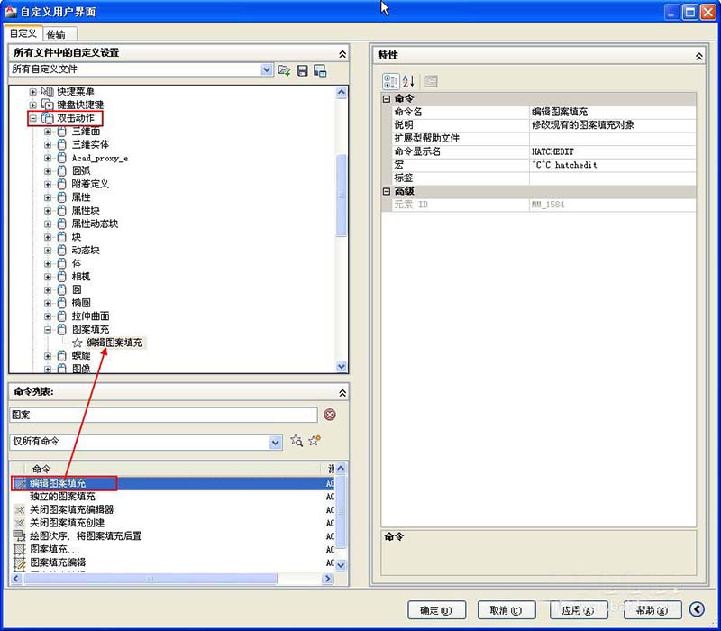 1、調用填充對話框的方法很簡單,就是執行填充編輯HATCHEDIT的命令,快捷鍵HE,但如果想要雙擊填充時也彈出對話框的話,就需要執行CUI命令,在自定義界面對話框中將填充圖案的雙擊動作設置為填充編輯,如圖所示。