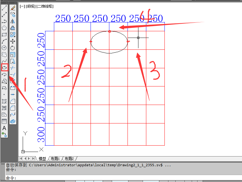 4、、頭部框架。點擊右邊橢圓工具。點擊頭部格子左邊中點偏下方,點擊頭部格子右邊中點偏下方,點擊頭部格子上方正中央,頭部框架搭好了。