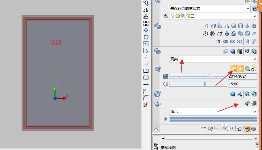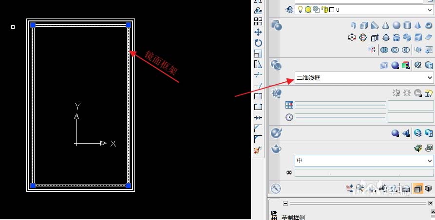 6、接下來繪制鏡面。輸入ucs,新建三維坐標,方便平面圖繪制。在進入二維繪圖界面繪制鏡面。如圖所示。然后拉伸平面尺寸。最后使用材質工具分別為鏡框和鏡面賦予材質。參數設置可以根據需要調整。這里因為電腦顯示問題不做說明。在使用著色面工具對鏡面著色。由于顯卡問題,渲染不太好,大家可根據自己情況進行渲染。最終如下圖。