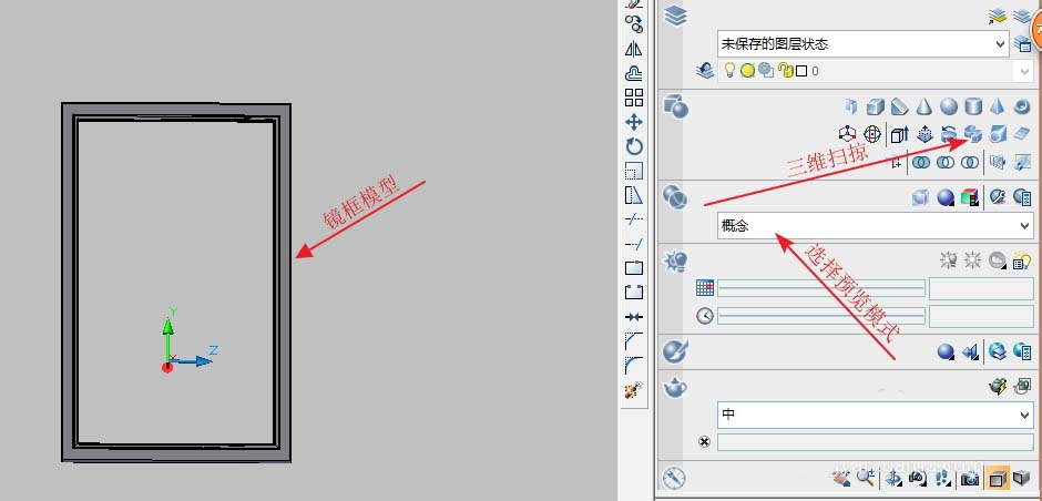 5、三維成型。進入三維工具欄,使用掃掠工具,先選取剛剛創建的面域,右擊鼠標。在選擇開始創建的矩形路徑(路徑必須是一個整體),我們會看到鏡框已經成形了。