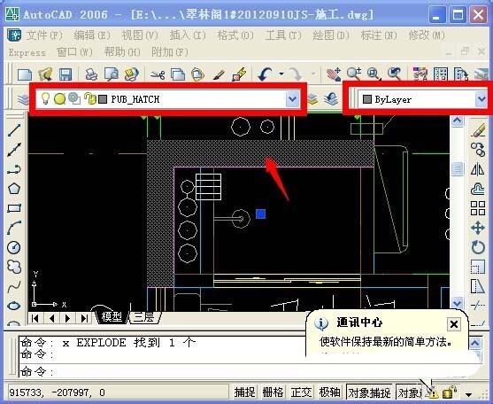 1、以AutoCAD2008為例(其他版本類似),先查詢柱填充層的顏色,將鼠標移動到柱子中間的填充層上,當填充層變為虛點時,點擊鼠標左鍵,在頂部的圖層狀態欄中找到圖層名稱,本例中圖層名稱是"PUB_HATCH",并查看右側的顏色控制框,本例中為”ByLayer",意思是填充的顏色“隨圖層”