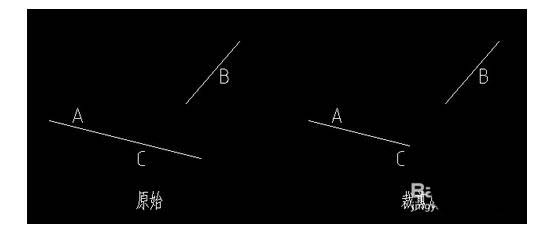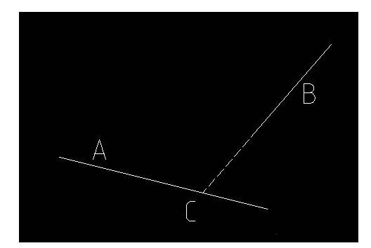 線段A與線段B不相交,但與線段B的延長線交與C點,通過上面的“edgemode”命令我們設置好后,以后就可以不用更改了,這個命令會一直存在的。若我們想將僅保留線段A在C點以上部分,我們可以使用“TR”命令即“TRIM”命令。進行裁剪