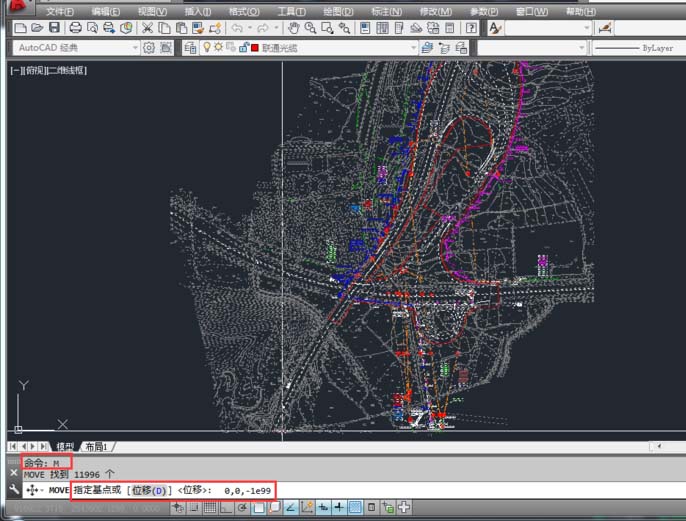 6、按鍵盤上的“ctrl+a”將畫面全選。在命令行輸入“M”,按鍵盤上的“空格鍵盤”或者“Enter”。再次輸入第一點(diǎn)位置 0,0,-1e99 按鍵盤上的“空格鍵盤”或者“Enter”確定,然后輸入第二點(diǎn)位置 0,0,0 按鍵盤上的“空格鍵盤”或者“Enter”確定。如下圖: