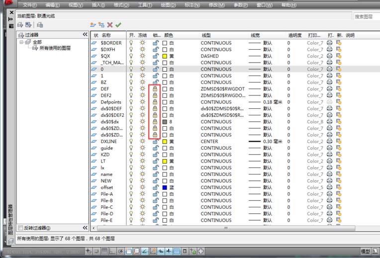 3、從上圖可以看了很多線條。文字,都不在同一個(gè)平面上。接下來我們把它放在平一個(gè)平面上。但是現(xiàn)在我先來看一下圖層有沒有被鎖住,如果被鎖了要把鎖打開。輸入“la"命令,按鍵盤上的“空格鍵盤”或者“Enter”。彈出圖層管理器。把標(biāo)“鎖”的圖層都打開。依次可以拉動滾動條檢查。完成后點(diǎn)擊關(guān)閉圖層管理器。如下圖: