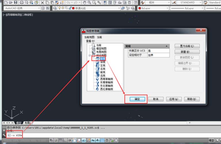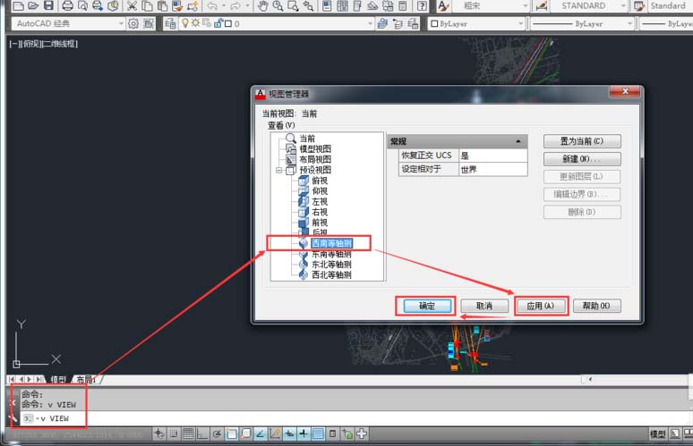 2、在這里我們可以切換到西南等軸測,檢查觀看,在命令行輸入“V”,按鍵盤上的“空格鍵盤”或者“Enter”。彈出視口管理器中雙擊選擇“西南等軸測”。點(diǎn)擊“應(yīng)用”。“確定”。如下圖: