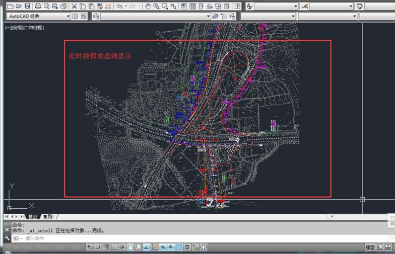 4、在命令行輸入“V”,按鍵盤上的“空格鍵盤”或者“Enter”。回到俯視視圖。按鍵盤上的“ctrl+a”將畫面全選。如下圖: