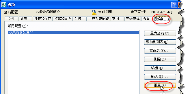 3、打開“選項”窗口,點擊“配置”選項卡,再點擊下方的“重置”按鈕。