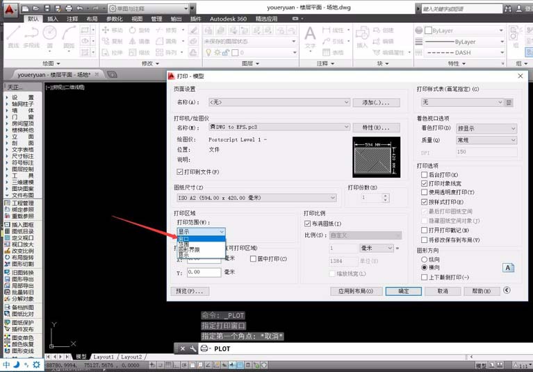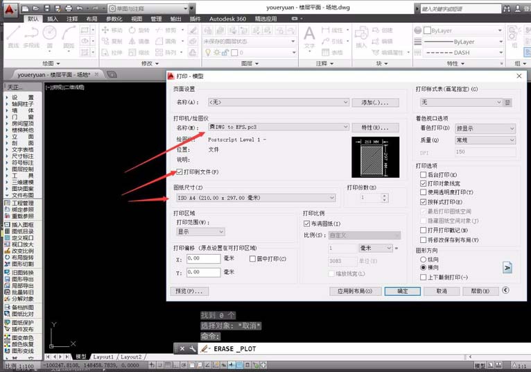 5、在“名稱”選項中,選擇導出的格式名稱,我們需要導出到PS格式文件,因此我們選擇“EPS”格式,并且勾選“打印到文件”,并在下方選擇打印的圖紙大小。
