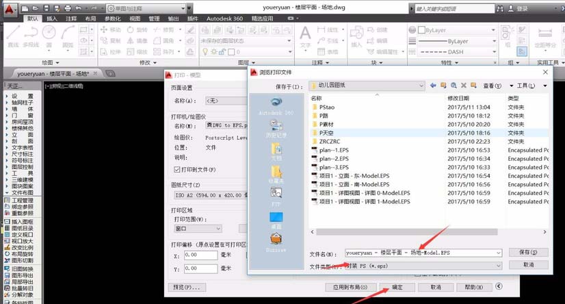 8、完成打印設置后,我們即可點擊“確定”,AutoCad會彈出文件保存路徑設置,選擇合適的路徑后,即可點擊保存,進行圖紙的保存,可以看到格式為“封裝PS”。