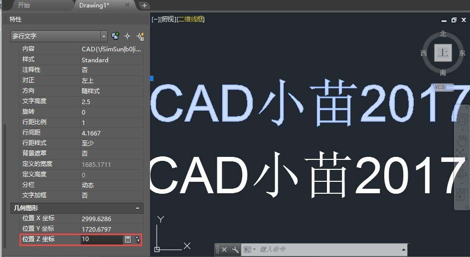2、選中文字,輸入CO,回車,復(fù)制一份文字到上方。選中復(fù)制的文字,打開特性面板(CTRL+1),在特性面板中將Z坐標設(shè)置為10,如下圖所示。