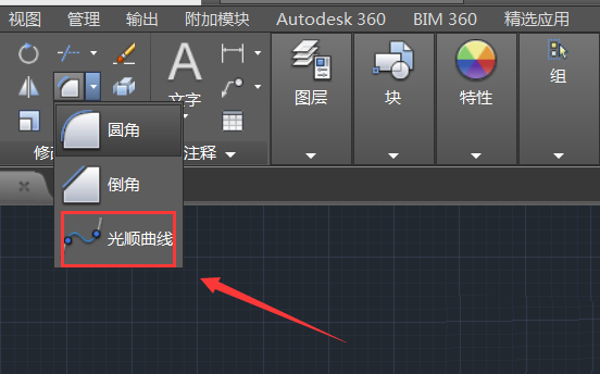 4、在圓角命令的子級菜單里找到光順曲線命令,如圖所示: