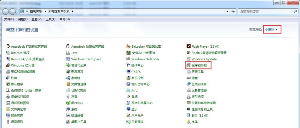 2、打開控制面板后,在右上角選擇小圖標(biāo),然后找到程序和功能,打開。