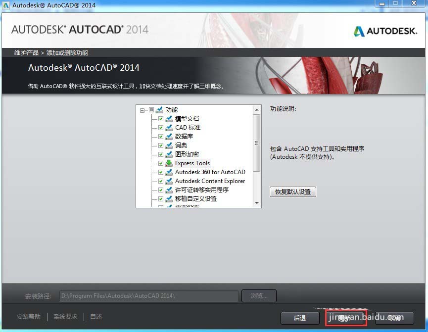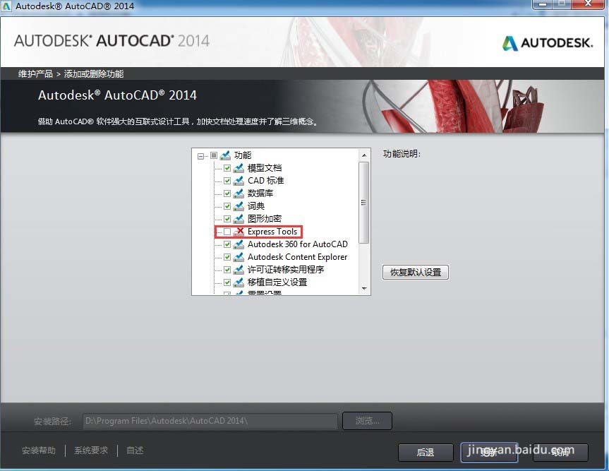 4、在彈出對(duì)話框中選擇“添加或刪除功能”——在功能展開項(xiàng)下面,選中“Express tools”——點(diǎn)擊右下角更新按鈕,然后等待更新完成。