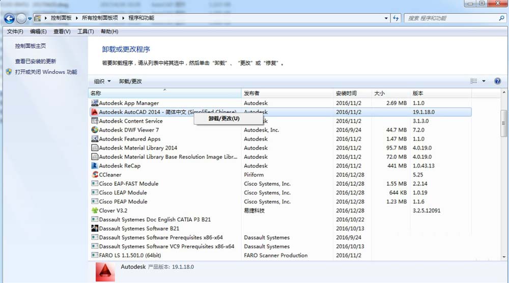 3、找到“Autodesk Auto CAD 2014……”右鍵--單擊“卸載/更改”