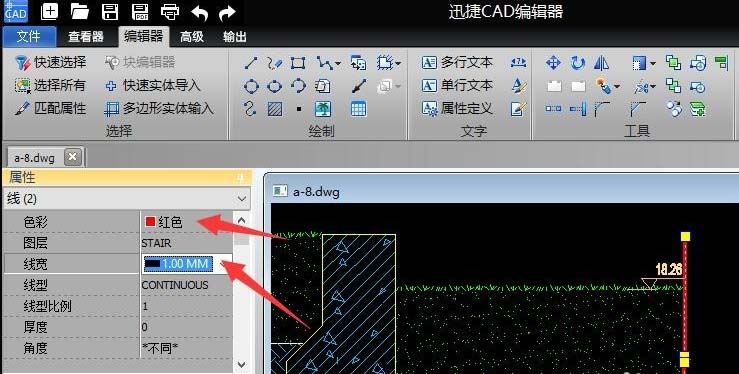 6、待相應圖形對象被選中時,我們就可以在左側“屬性”窗口中對其“顏色”和“線寬”進行設置操作了。
