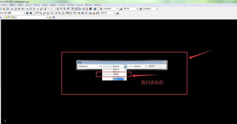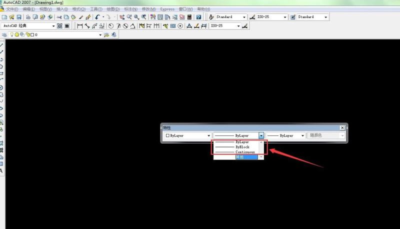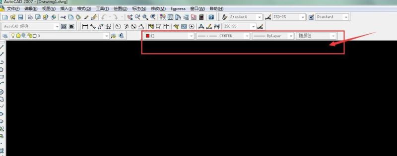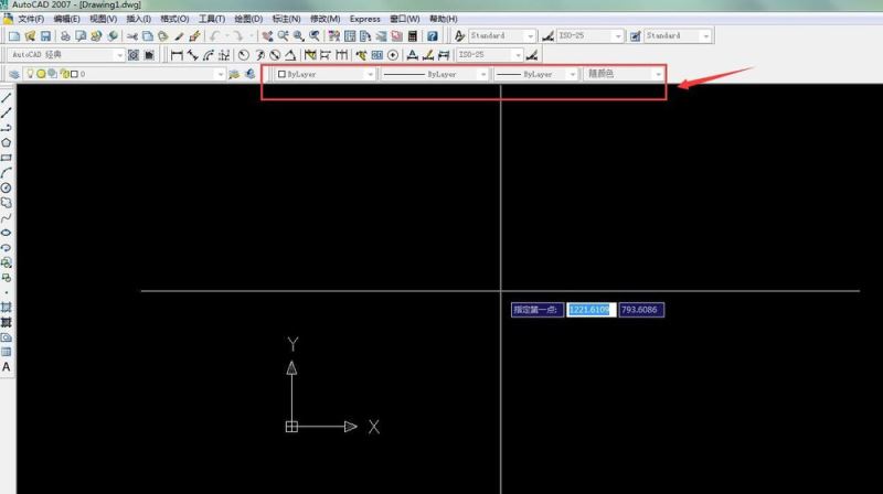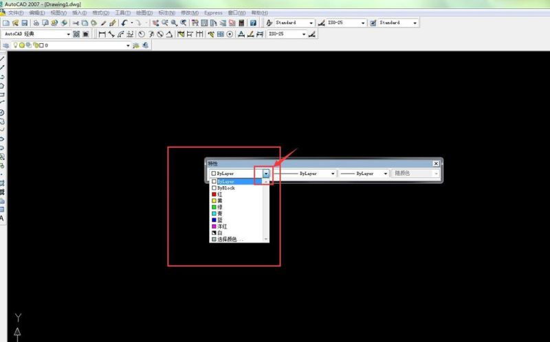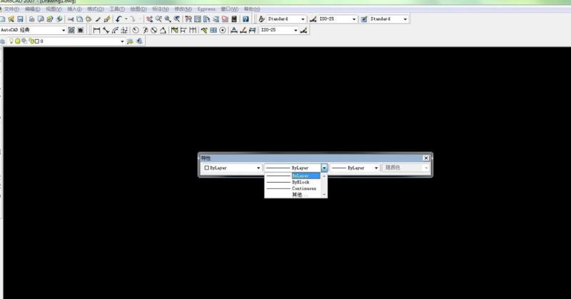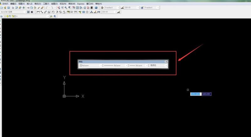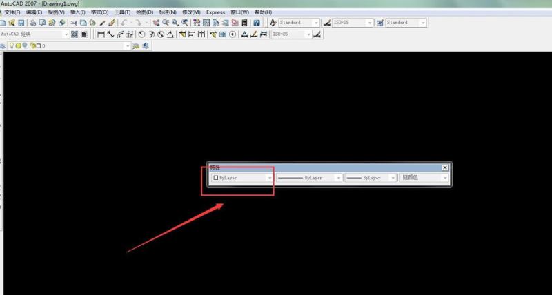 5、然后我們在工作區(qū)可以看到特性的菜單 我們可以設(shè)置特性了 第一個特性是線性顏色的控制 “bylayer”顏色的控制 如圖