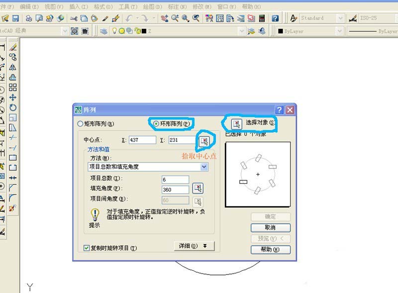 我們都知道圓的角度是360°,那么6等分時,只要畫一條360÷6=60°的線即可:點擊直線命令或輸入L,接著點擊圓心,然后輸入shift+@,輸入線的長度,再輸入shift+∠,輸入60°,然后確認(按回車即可,得到如下圖1);接著陣列直線:點擊陣列命令或輸入AR,出現陣列圖框(如下圖2),在圖框中選擇環形陣列,項目總數為6,點擊選擇對象,選擇直線,右擊,然后點擊拾取中心點,再點擊圓的中心點,最后點擊圖框的確定按紐即可(如下圖3)。