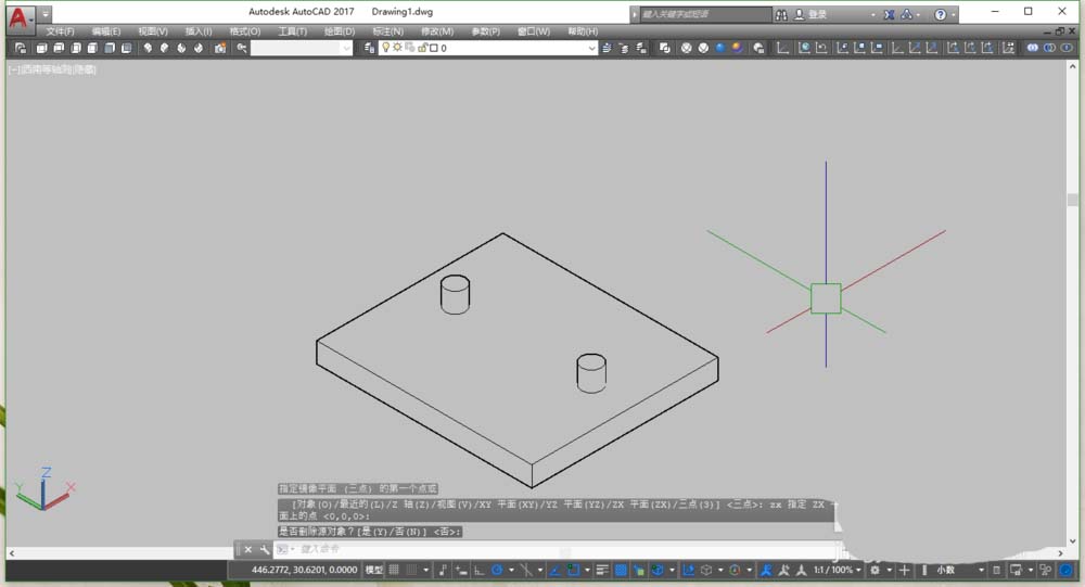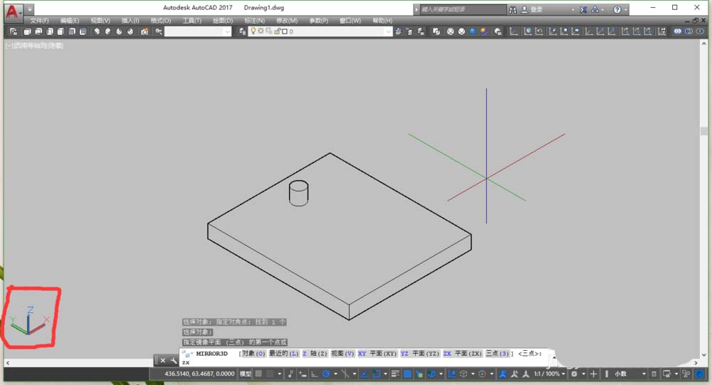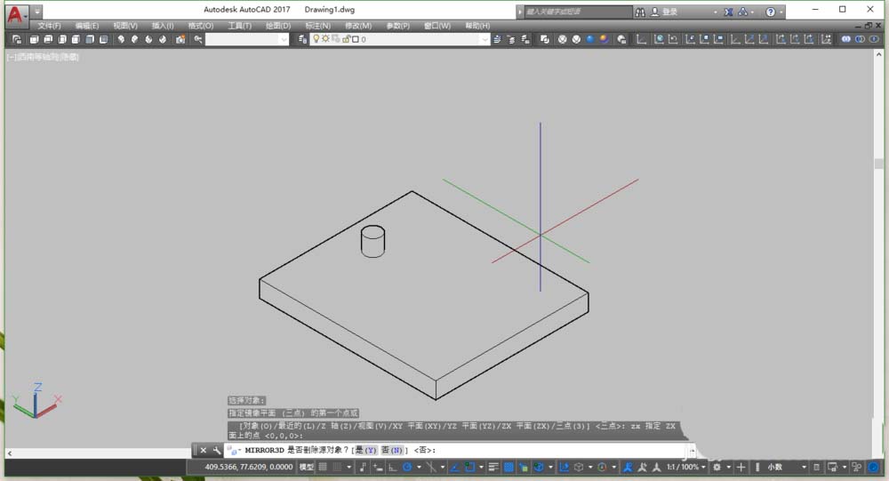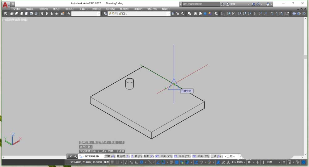 4、平面鏡像針對(duì)的是一根直線,三維鏡像當(dāng)然就針對(duì)的是一個(gè)面。這時(shí),命令行會(huì)提示選擇鏡像面的方式,可輸入“3”,意思就是通過手動(dòng)指定3個(gè)點(diǎn)來確定一個(gè)面。也可輸入“zx”(這個(gè)根據(jù)你所需要的鏡像面來定,注意參考命令行的介紹),這里的依據(jù)是看坐標(biāo)系,zx代表z軸和x軸所指定的一系列平面,這個(gè)時(shí)候,只需再指定一點(diǎn)即可