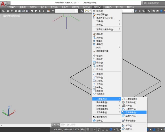 3、選擇“修改”-“三維操作”-“三維鏡像”命令,當(dāng)然也可命令行輸入“MIRROR3D”-“空格”,之后,選擇要鏡像的三維實(shí)體,“空格”
