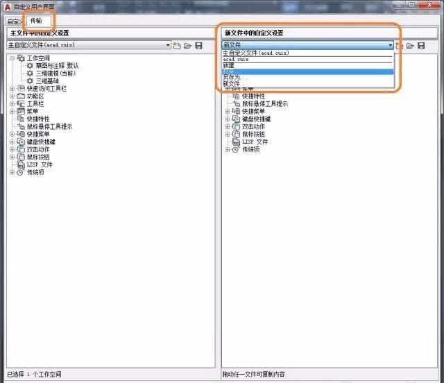 四、選擇“傳輸”,新文件自定義設置選擇“打開”選項: