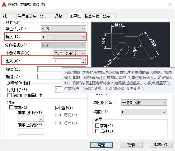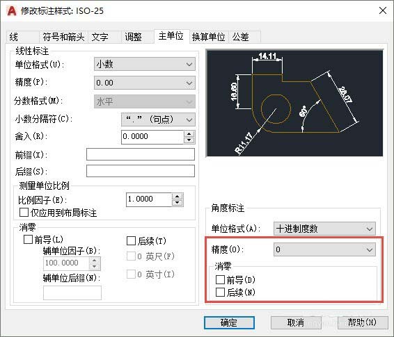 3、只有當(dāng)我們需要標(biāo)注值是一些特殊值,如0.25、3、5的倍數(shù)時(shí),我們才輸入舍入值。上面說的精度、舍入、消零都是針對(duì)線性的標(biāo)注的,角度標(biāo)注也有精度和消零的設(shè)置,但沒有舍入的設(shè)置,如圖所示。
