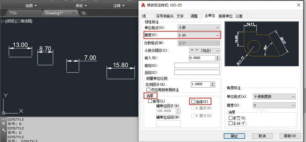 2、如果我們要保留小數(shù)點(diǎn)后一定位數(shù),同事為了讓標(biāo)注看起來比較整齊一致,可以不進(jìn)行消零處理,如圖所示。