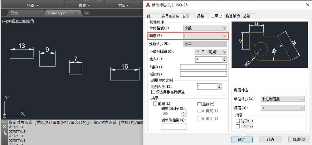 1、如果我們只是希望標(biāo)注進(jìn)行正常的四舍五入,直接設(shè)置精度后的小數(shù)點(diǎn)的位數(shù)就可以了,假如我們希望標(biāo)注是整數(shù),可以將精度設(shè)置為0,如圖所示。
