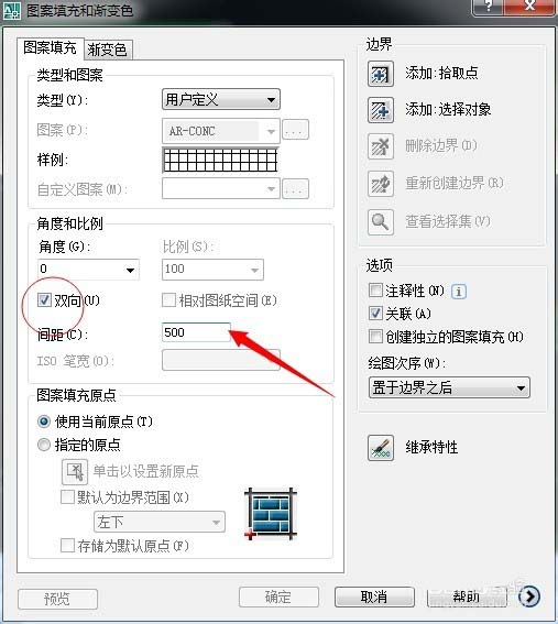 3、勾選--雙向,比如是需要畫500*500的地磚,就把間距輸入“500”,300*300就輸入300,這里就不多舉例了,我們先畫500來演示,如圖: