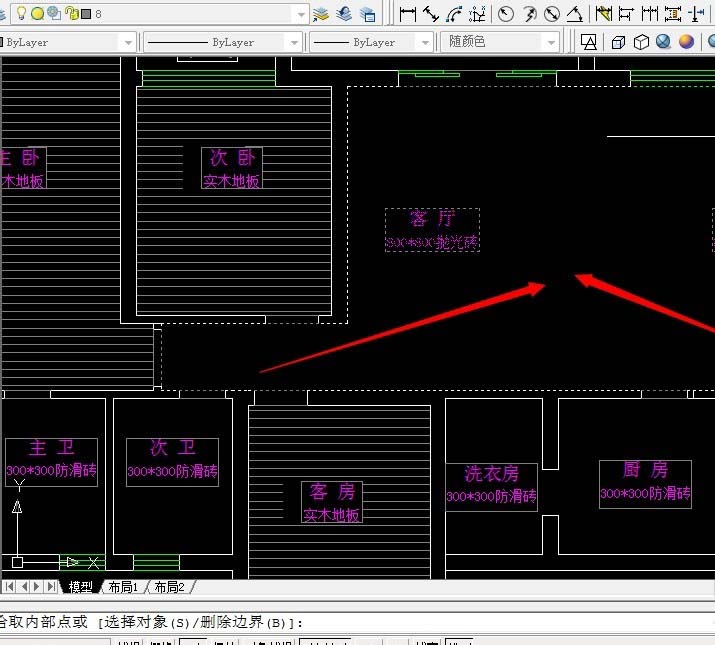 4、拾取點,直接拾取客廳與餐廳部分,如圖: