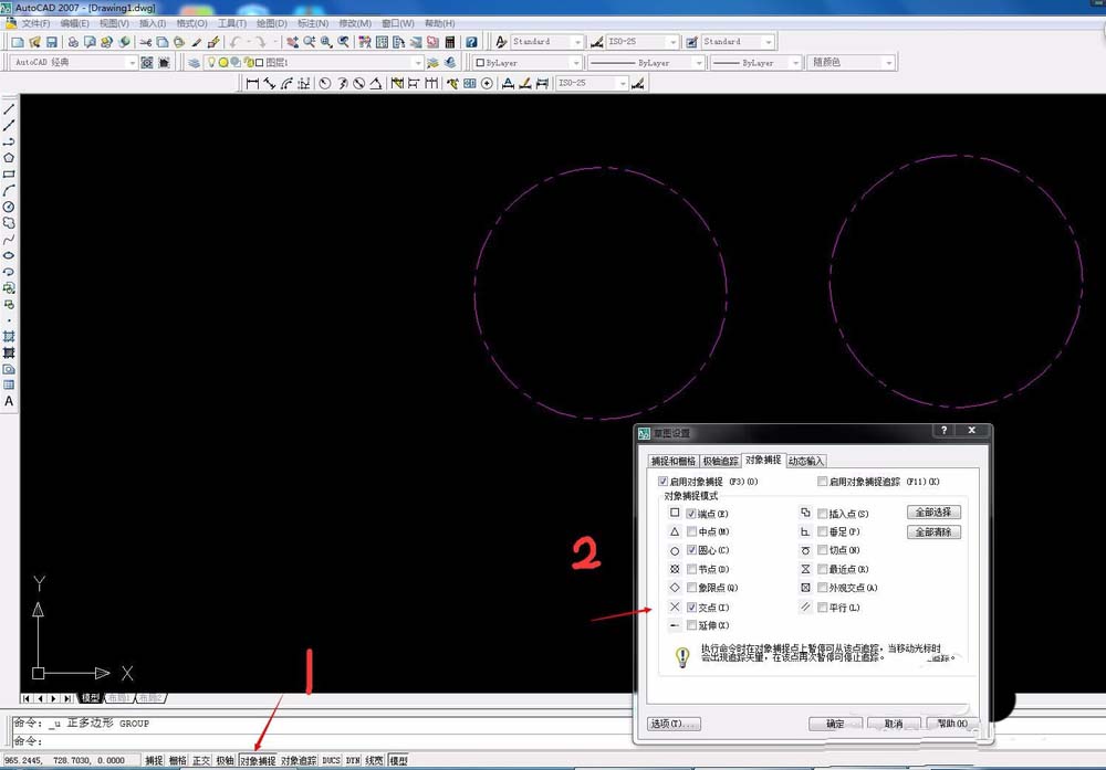 在開始畫圖之前先畫兩個半徑均為100的圓作為輔助對象,并右擊對象捕捉設置對象捕捉對象如下圖所示;此步驟是為了很方便的識別捕捉到圓心。