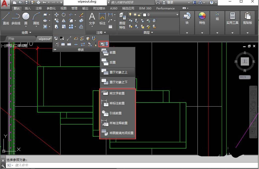 3、有時我們在畫完圖后才發現有一些文字、標注被填充所遮擋,如果全圖檢查,既費力又難免有遺漏,針對這種狀況,CAD后續版本不斷增加了針對這種狀況的處理功能,因此就有了文字前置、標注前置、引線前置、所有注釋前置和填充后置的相關命令,可以一次性處理可能存在的遮擋問題。