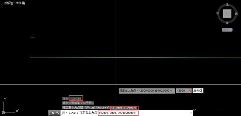 根據我們需要的界限大小來指定右上角點的坐標,假設我們的圖形最后是要1:100打印到A3的紙張上,就需要將左上角設置為42000,29700。