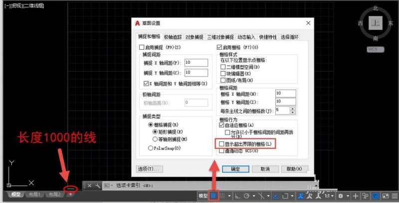 如果你的CAD版本較低,柵格還是用點顯示得話,你把柵格打開,可以看到柵格點顯示范圍就是圖形界限的范圍。如果是高版本,需要在柵格設置對話框中取消勾選“顯示超出界限的柵格”,才能通過柵格線實實在在地看到圖形界限,如圖所示。