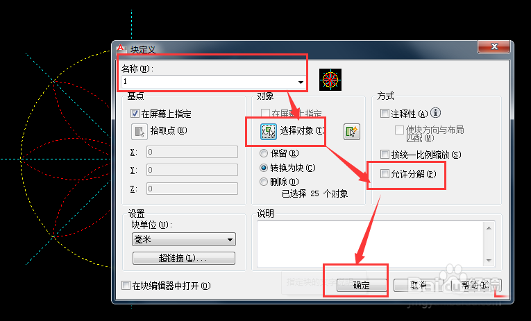 2、先將其設置成不可分解的塊:B——空格——調出塊定義窗口——先命名——再選要設置塊的對象——允許分解前不要打勾——確定
