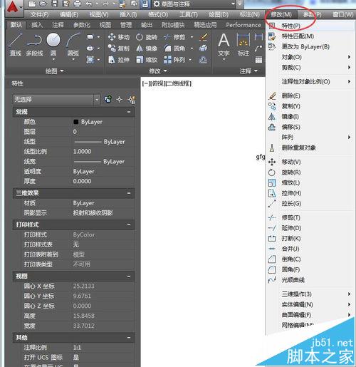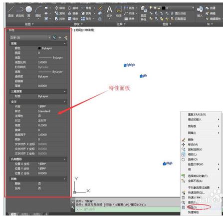 2、打開cad特性面板,菜單欄中修改>特性,或者選中文字右鍵>特性